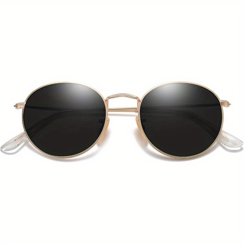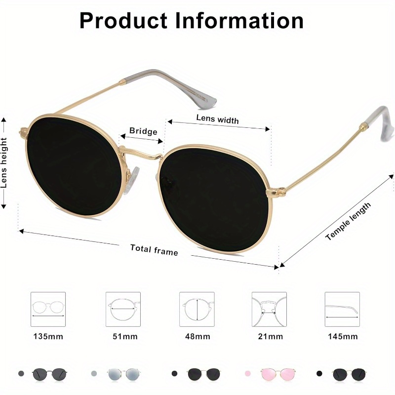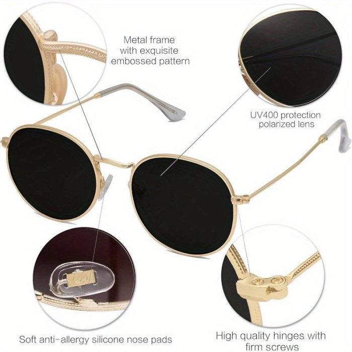 Polarized lenses eliminate glare and harmful UV rays to safeguard your vision. The ultra-light stainless steel frame is both comfortable and sturdy. The fashionable round frame suits various face shapes. Lens dimensions are 51mm in width and 46mm in height, with arm length measuring 144mm. A microfiber pouch and cleaning cloth are provided for convenient maintenance.